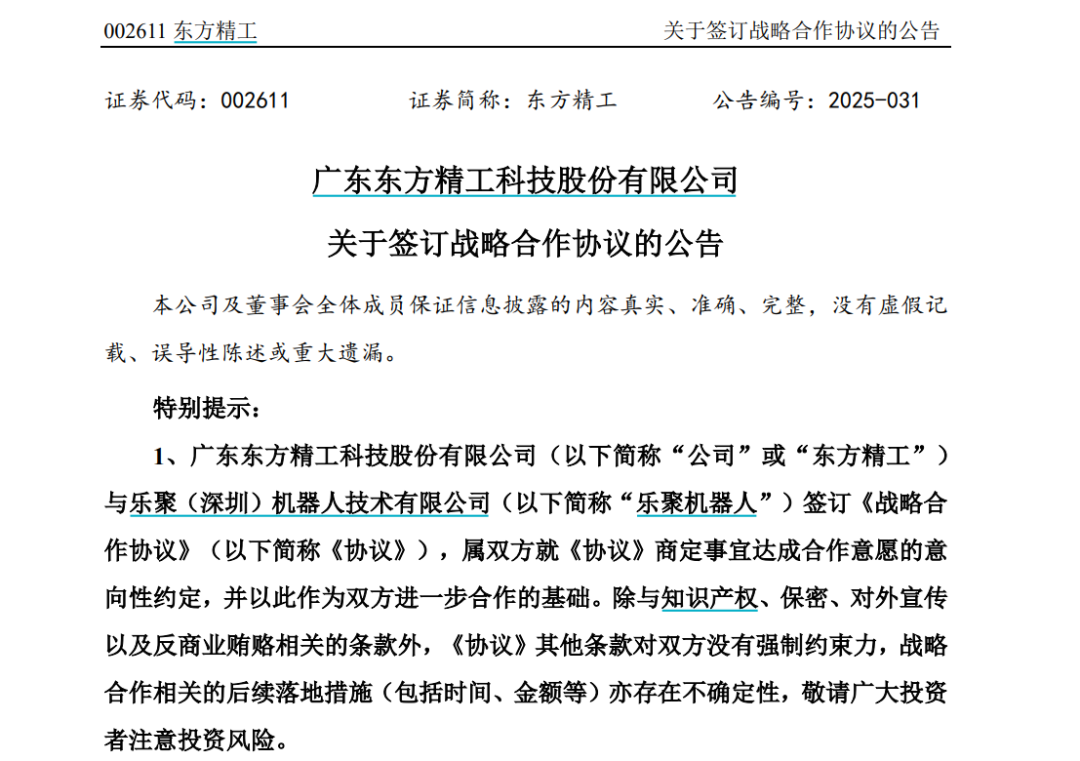 7月21日,东方精工发布公告称,公司与乐聚机器人签署了《战略合作协议》。双方本着友好合作、互利互惠、共同发展的原则,建立战略合作伙伴关系,聚焦具身智能机器人方向,在生产制造、场景拓展、业务推广等方面开展战略合作。